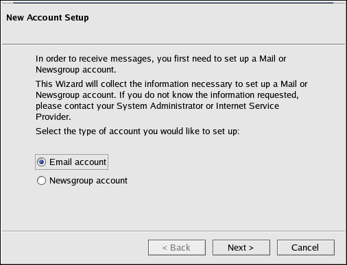 You are presented with a New Account Setup screen. Select Email account, which allows you to configure your email connection. Follow the on-screen instructions and fill in the information you collected from your ISP or administrator in the text boxes provided.