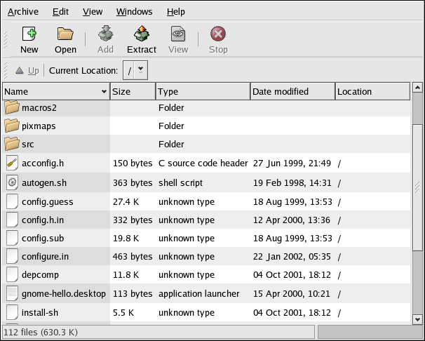 To start File Roller click Main Menu => Accessories => File Roller. You can also start File Roller from a shell prompt by typing file-roller. Figure 4-1 shows File Roller in action.